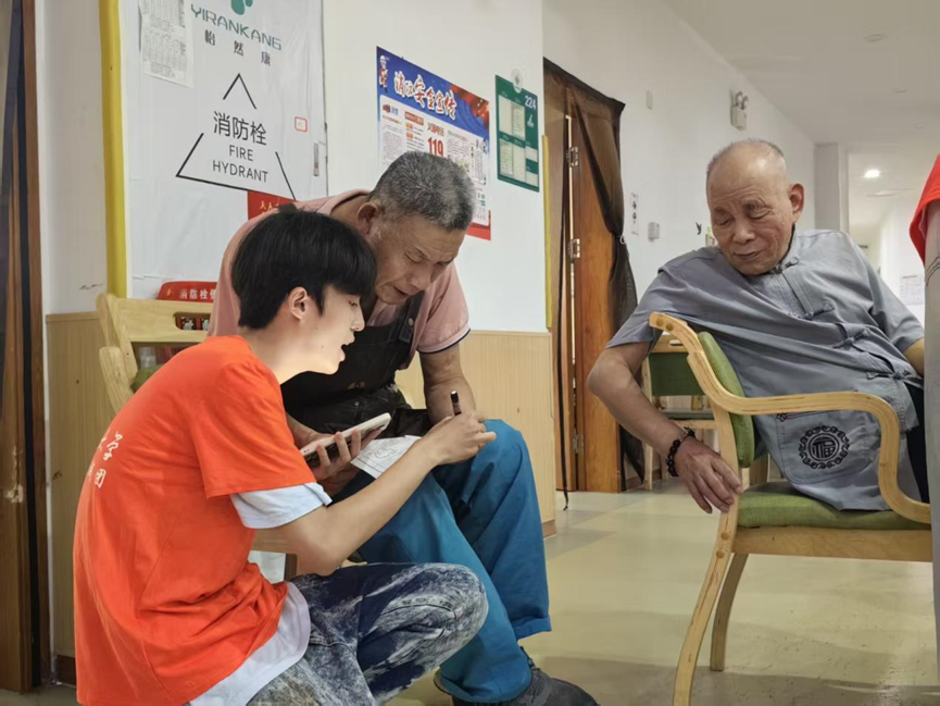 午后,实践队转战怡然康护理院。针对部分老人因亲人陪伴较少而产生的落寞情绪,志愿者先以“卡片寄意”形式搭建情感联结,与老人共同书写暖心话语、绘制简易图案;待老人情绪放松后,同步开展养老院老人需求服务调查与阿尔兹海默症认知普及。志愿者蹲在坐代步椅的老人身边,一边帮老人扶正卡片,一边轻声提问:“奶奶,您觉得现在住的地方,在照顾您的身体方面,还有哪些地方可以做得更好呀?”“我这儿有张简单的记忆小测试图,咱们一起看看这上面有几种水果,您数给我听听好不好?”