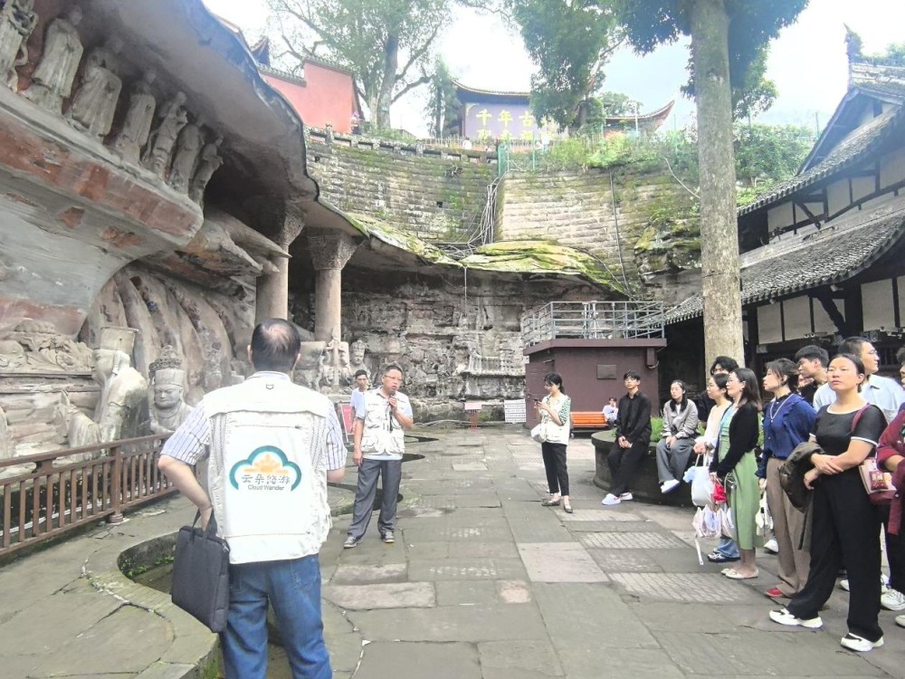 “都以为风化是岁月杀猪刀,其实每一刀都刻着温度。”在石刻参观区,文博副研究馆员冯太彬现场讲解大足石刻与气象密码。从温度、湿度、降水、酸雨、日照、冻融破译气候变化与文化遗产存续内在联系。